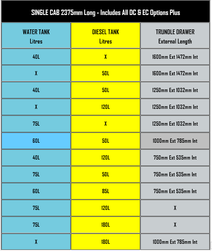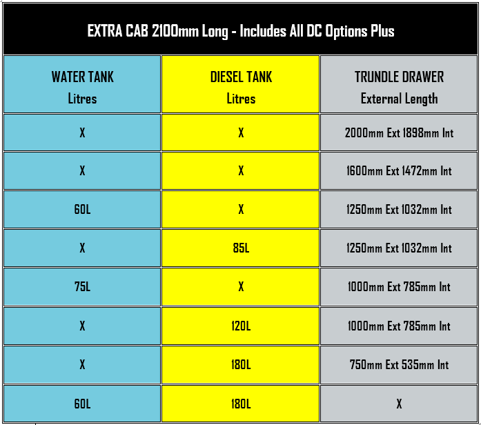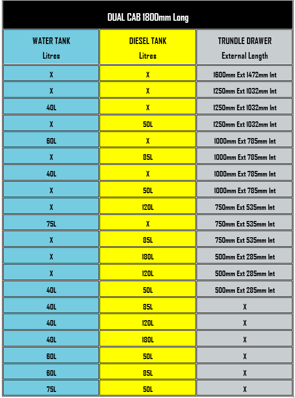 *Note. Land Cruiser only under tray spare tyre uses 1000mm room and can’t be used when trundle drawer selected.